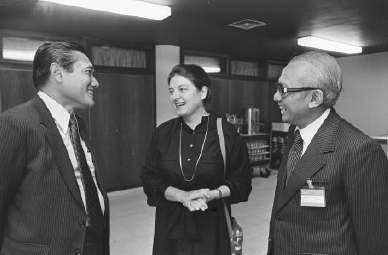 Indonesian economists Ali Wardhana (left) and Widjojo Nitisastro (right), members of Suharto’s “Berkeley mafia,” speak with Dutch Minister for Development Cooperation Eegje Schoo at a meeting of the Inter-Governmental Group on Indonesia in The Hague, Netherlands, June 1983.Credit: Rob Croes/Anefo
